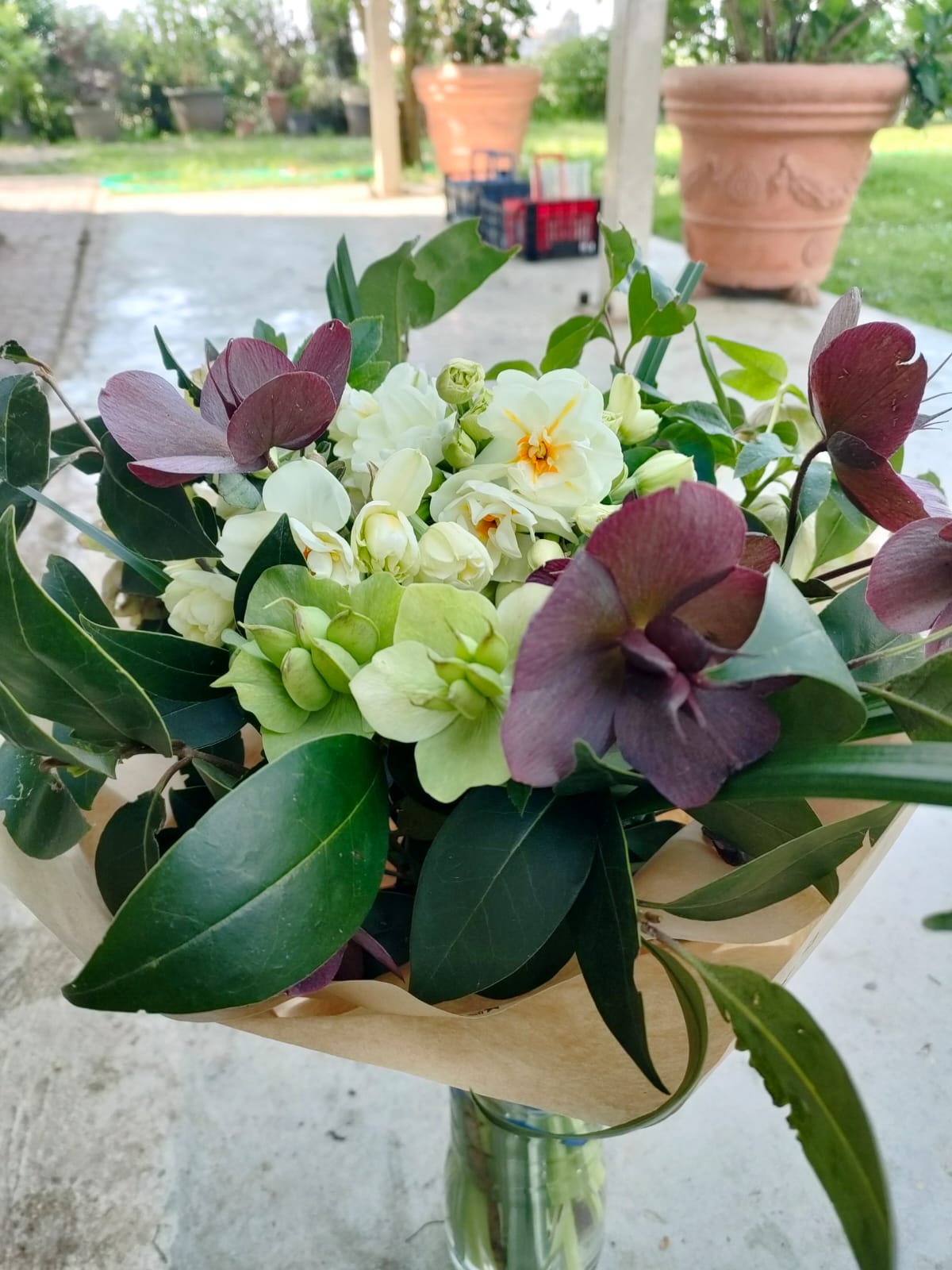 mazzo composto da ellebori, narcisi e ligustro