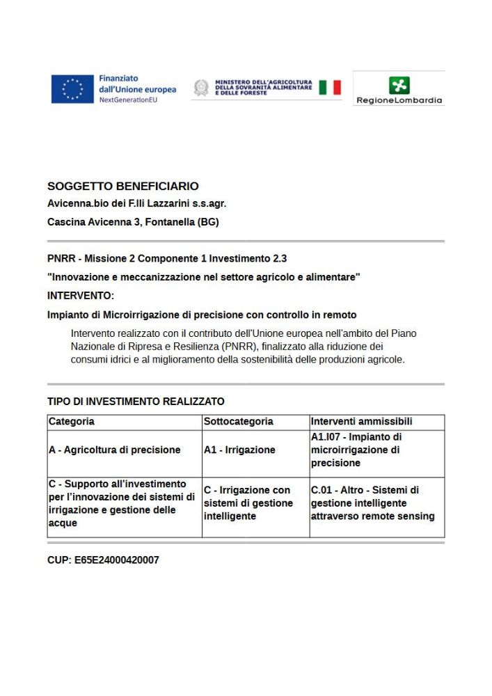 Siamo felici di annunciare che Avicenna.bio dei F.lli Lazzarini s.s.agr. ha completato un importante progetto di ammodernamento tecnologico grazie al supporto dell'Unione Europea e al PNRR.